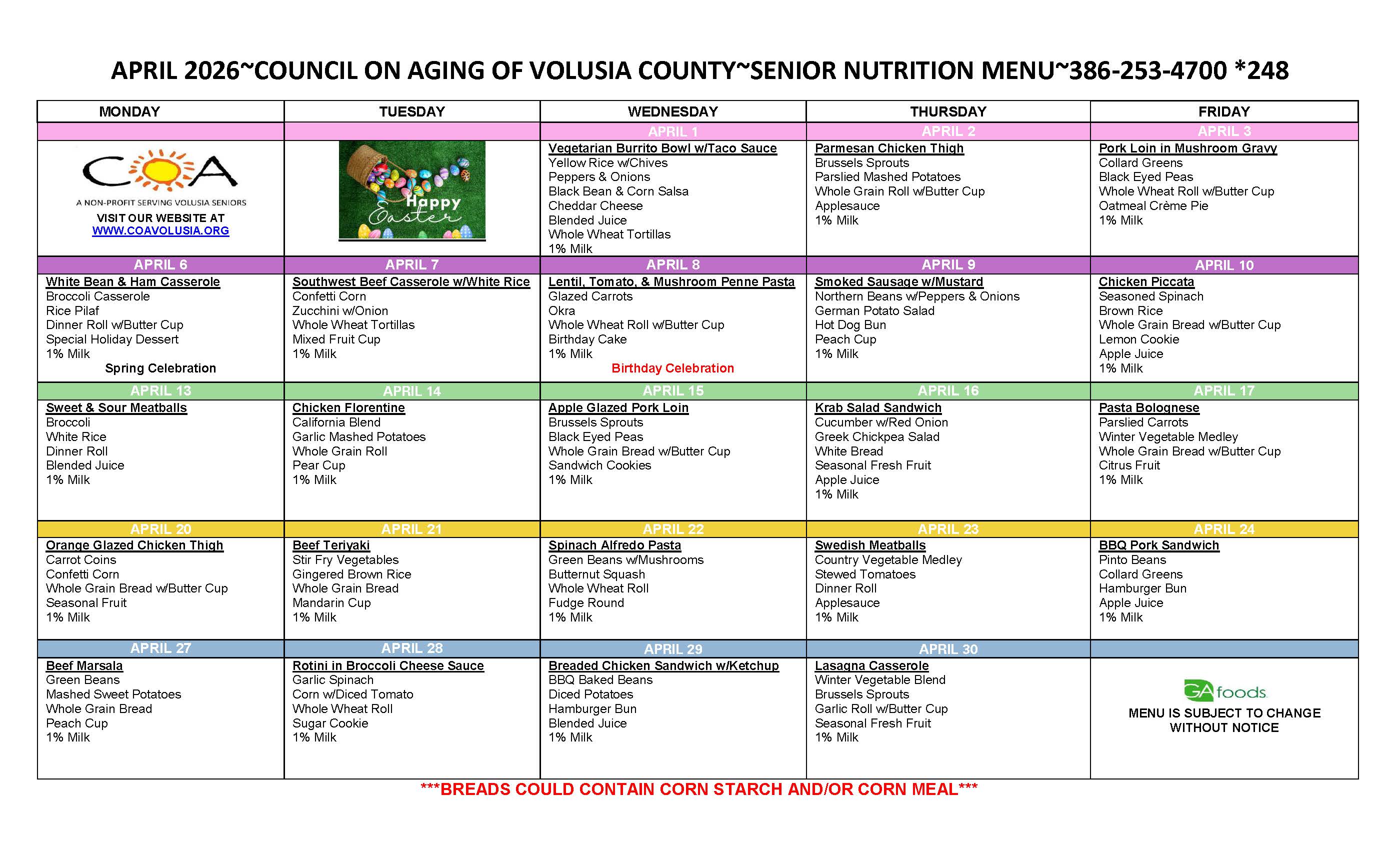 COA New Smyrna Beach Senior Center & Neighborhood Nutrition Center Menu